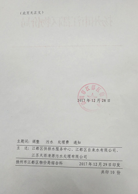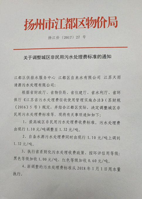 區(qū)物價局《關(guān)于調(diào)整城區(qū)非民用污水處理費標準的通知》