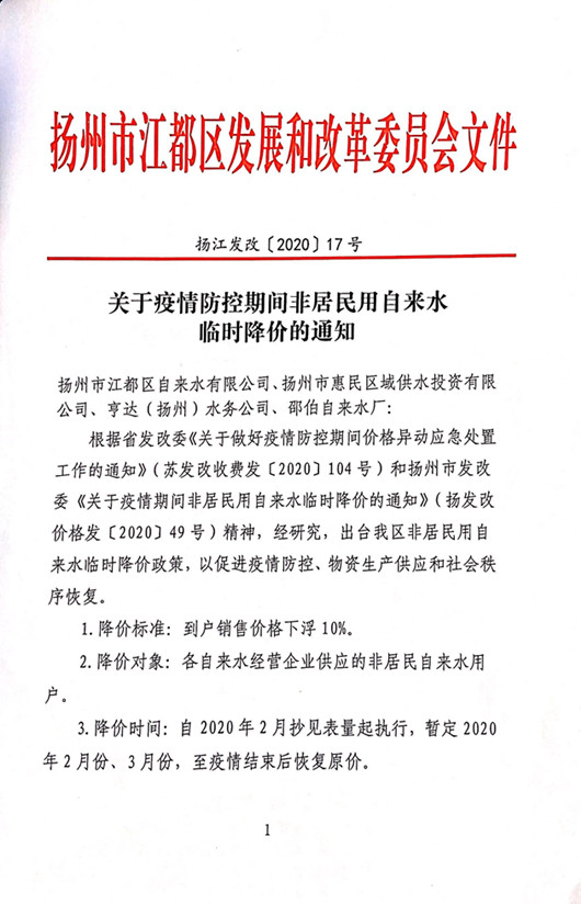 關(guān)于疫情防控期間非居民用自來水臨時降價的通知