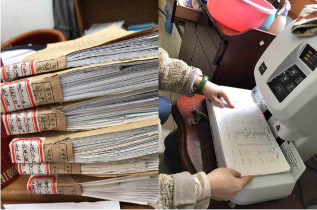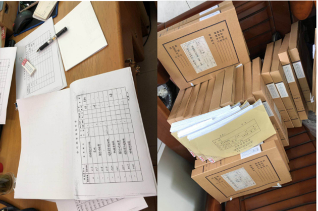 圖為財(cái)務(wù)檔案整理現(xiàn)場(chǎng)及其所展示的相關(guān)工作流程