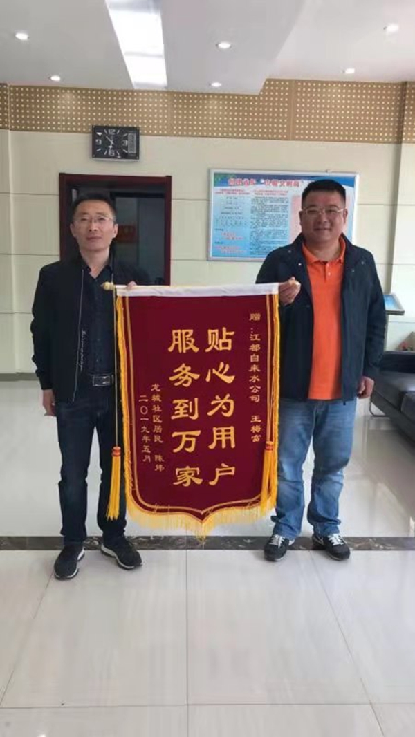 2019年5月的一天,自來水公司又收到用戶送來的錦旗,原來是王梅富同志又一次解決了用戶家中漏水的問題。當公司打電話告知在外面工作的王梅富同志來大廳接受這一喜訊時,他在電話里說這是他應該做的,十分感謝這位用戶的好意,但是今天任務重,就來不及趕回來當面感謝了,他承諾以后會一如既往的認真工作,不辜負這份榮譽。