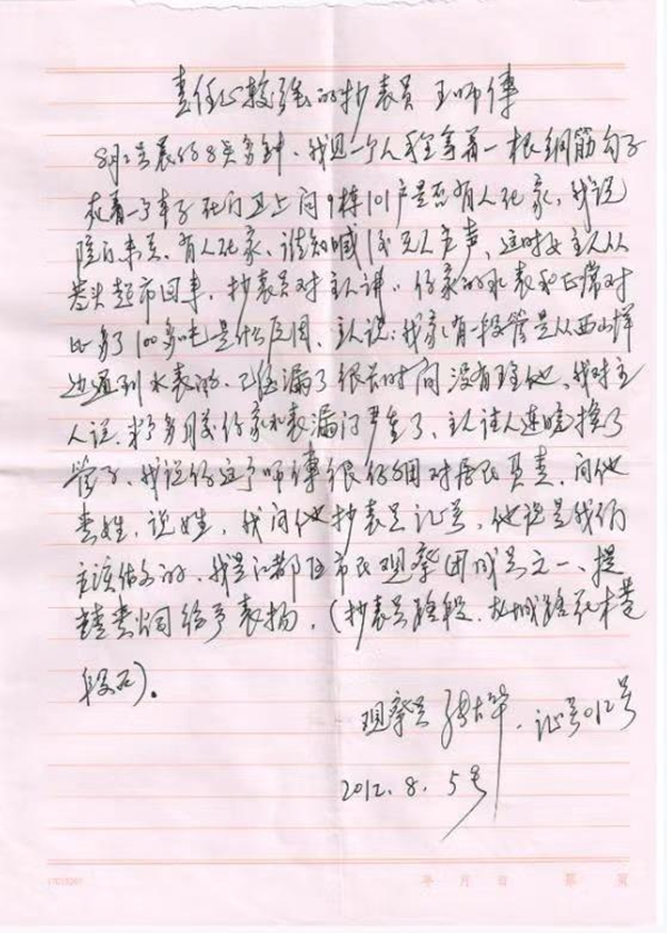 2012年8月5日,自來水公司收到一封來自江都市民觀察團成員的表揚信,信上寫著王梅富同志在一次日常工作中,發(fā)現(xiàn)有一用戶家中無人居住,嚴重漏水的問題,前后幾次往返鄰居和物業(yè)之間登記檢查,直至聯(lián)系上用戶,并確認用戶已將水表閥門關緊,不再漏水,才放心離開。事后王梅富同志只是說,這是他工作中很平常的一件小事,是自己應盡的工作職責。