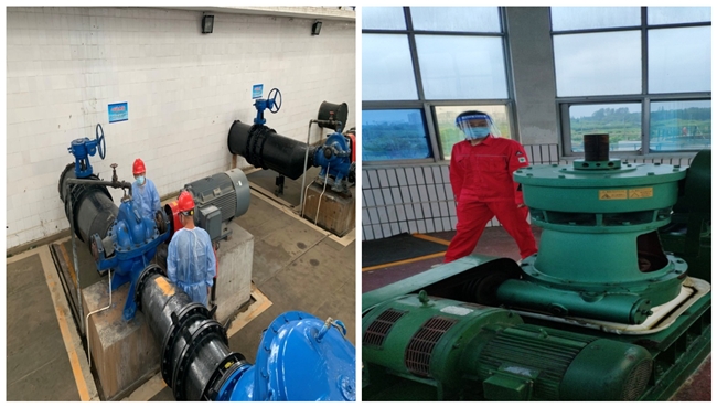 圖六:二水廠設(shè)備組成員檢查機(jī)泵運(yùn)行狀況 圖七:三水廠設(shè)備組成員檢查機(jī)泵運(yùn)行狀況