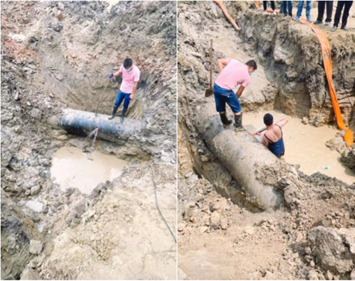 8月11日上午8時(shí)許,公司得到真武楊莊京滬高速下一處DN800球管漏水消息后,迅速組織人員趕往現(xiàn)場。經(jīng)現(xiàn)場勘查,因挖機(jī)施工失誤造成管身破出一個(gè)20公分大的洞。為了防止停水造成大范圍群眾和重點(diǎn)單位部門用水受到影響,經(jīng)驗(yàn)豐富的搶修人員對此迅速做出搶修方案:關(guān)閉泵站增壓泵,低壓供水,用其木棍堵住部分余水,便于人員入坑打抱箍。經(jīng)過4個(gè)多小時(shí)艱苦奮斗,于下午13點(diǎn)30分,供水恢復(fù)正常。