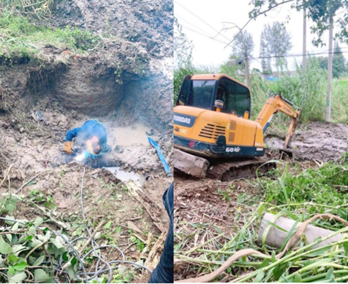 8月12日上午8時(shí)許,公司接到群眾電話稱,江都區(qū)丁伙鎮(zhèn)紅廟渠南路魚塘附近,有水管出現(xiàn)爆漏。龍泉公司項(xiàng)目部夏陽華經(jīng)理帶領(lǐng)搶修人員立即到達(dá)現(xiàn)場核查,經(jīng)查明是DN500鋼管老化裂出口子。事故點(diǎn)在小路半坡大樹下,靠近魚塘且土質(zhì)松軟濕滑,機(jī)械施工難度較大,修復(fù)時(shí)間也較長。歷經(jīng)9個(gè)小時(shí)才將漏點(diǎn)修復(fù)。