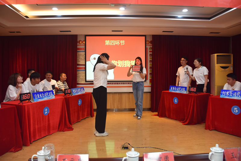 此次比賽分為小組共答題、個人必答題、搶答題、你劃我猜、風險題五種形式,并分五輪進行。共有五支代表隊參賽,分別是惠民、自來水、龍泉、水務(wù)、污水公司代表隊,且每個代表隊人員都是經(jīng)過層層篩選脫穎而出的。大家顯然是有備而來的,競賽過程精彩激烈,參賽選手們有的運籌帷幄、有的胸有成竹、有的應(yīng)對自如,各代表隊你追我趕、搶答器的聲音此起彼伏,現(xiàn)場戰(zhàn)況異常激烈,展示出了新時代水務(wù)公司團員青年的風采。