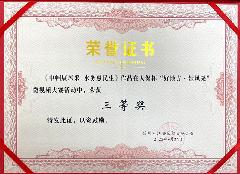 日前,水務(wù)公司創(chuàng)作的《巾幗展風(fēng)采 水務(wù)惠民生》作品在區(qū)婦聯(lián)舉辦的人保杯“好地方·她風(fēng)采”微視頻大賽活動中,榮獲三等獎。該視頻通過擷取和拍攝奮戰(zhàn)在供水事業(yè)各條戰(zhàn)線上女工有代表性的工作場景,集中展現(xiàn)了水務(wù)女工在各自崗位上辛勤勞作、甘于奉獻(xiàn)的新時代風(fēng)采。