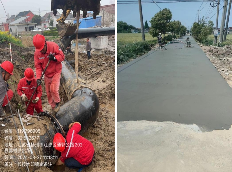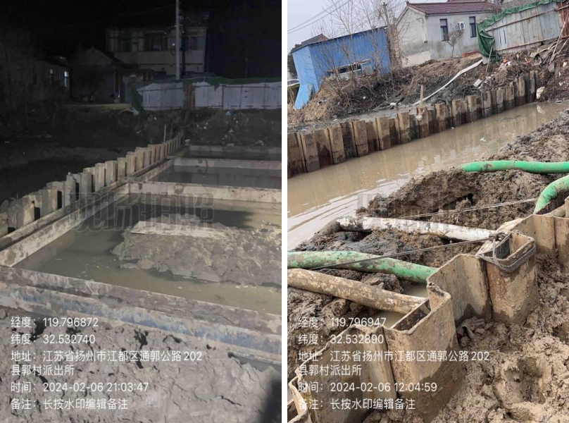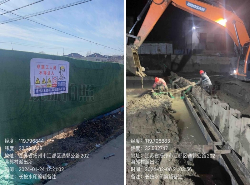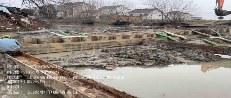 在施工過程中,東側原造橋壩頭設置過高,上游自來水漏水嚴重,挖機無法進場施工,人工拆除兩道壩頭。施工總體步驟:草袋圍堰支護,支護內明排水,靜壓打樁,圍堰施工,開挖,管道維修,管道打壓,回填,鋼板樁拆除,圍堰拆除。