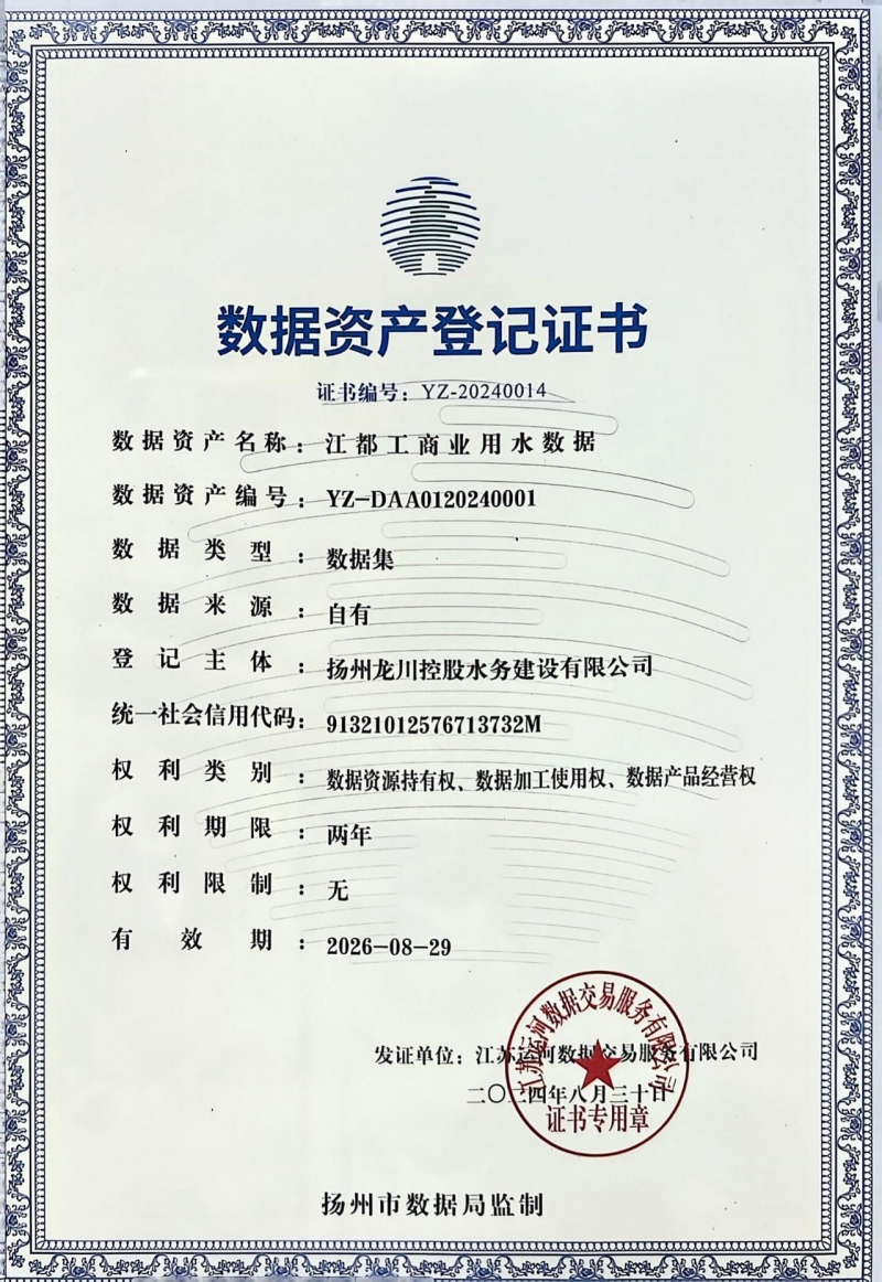 展望未來,揚州龍川水務(wù)將繼續(xù)秉持“以水為本、服務(wù)社會”的宗旨,不斷提升數(shù)據(jù)管理水平和服務(wù)質(zhì)量,為江都區(qū)經(jīng)濟與社會發(fā)展提供更加安全、優(yōu)質(zhì)、高效的服務(wù)。相信在數(shù)據(jù)資產(chǎn)登記證書的助力下,龍川水務(wù)將在智慧水務(wù)的新征程上創(chuàng)造更加輝煌的業(yè)績。