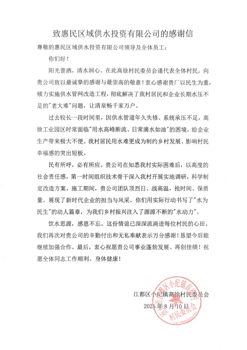 高徐村民委員會(huì)在感謝信中寫道:“施工期間,貴公司團(tuán)隊(duì)頂烈日、戰(zhàn)高溫,搶時(shí)間、保質(zhì)量。展現(xiàn)了新時(shí)代企業(yè)的擔(dān)當(dāng)與風(fēng)采。你們用實(shí)際行動(dòng)書寫了水為民生的動(dòng)人篇章,為我們鄉(xiāng)村振興注入了源源不斷的水動(dòng)力。”