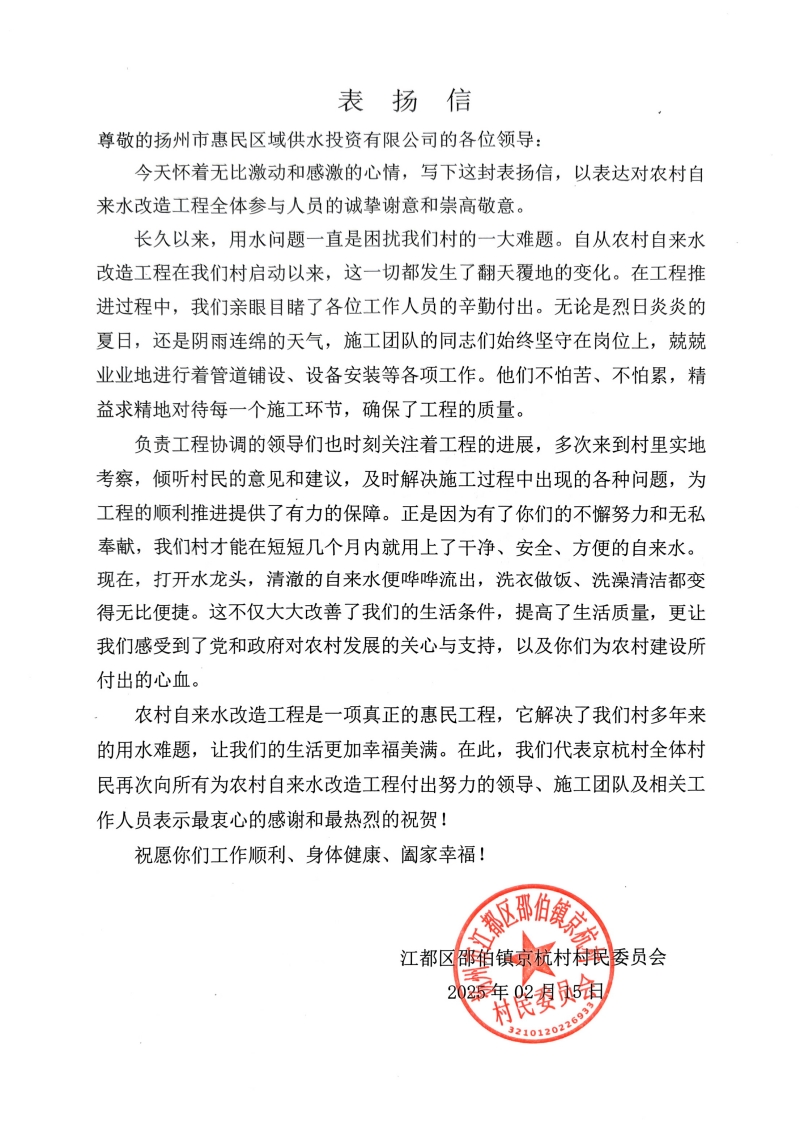 “以前村里因為用水問題,鄰里之間偶爾會鬧矛盾,現(xiàn)在水的問題解決了,大家的關(guān)系也更和睦了。”村干部笑著說。村民們自發(fā)組織起來,寫了這封表揚(yáng)信,用最樸素的方式表達(dá)感激之情。“這封信雖然寫得簡單,但每一個字都是我們的心里話。貴公司幫我們解決了大難題,我們打心底里感謝!”